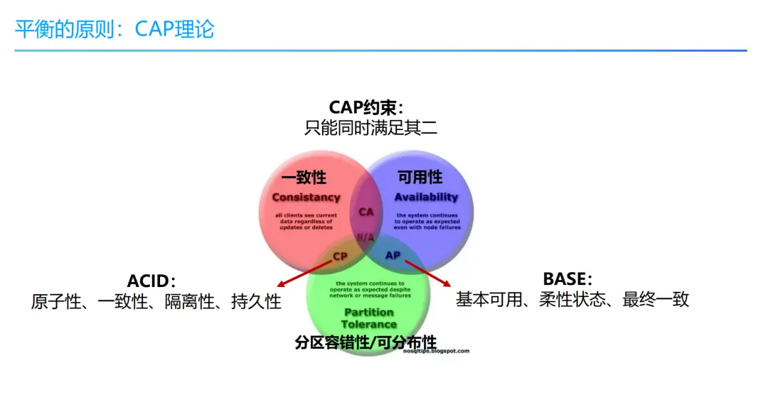 三个要素里面最多只能同时满足两点,而不能兼顾。在云时代,可分布性和分区容错性已经成为了基本配置。因此作为架构师,更多要在一致性和可用性之间做取舍和平衡。