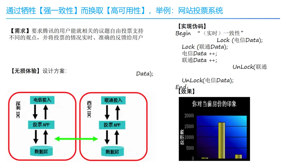 我们用一个案例来进一步理解 CAP 理论以及最终一致性。这是一个比较典型的分布式系统的原型,是我当年做网站开发的时候,做的一个投票系统产品。它需要支持这样的需求:要求腾讯的用户能就相关的议题自由投票支持不同的观点,并将这种投票情况实时准确地反馈给用户。
