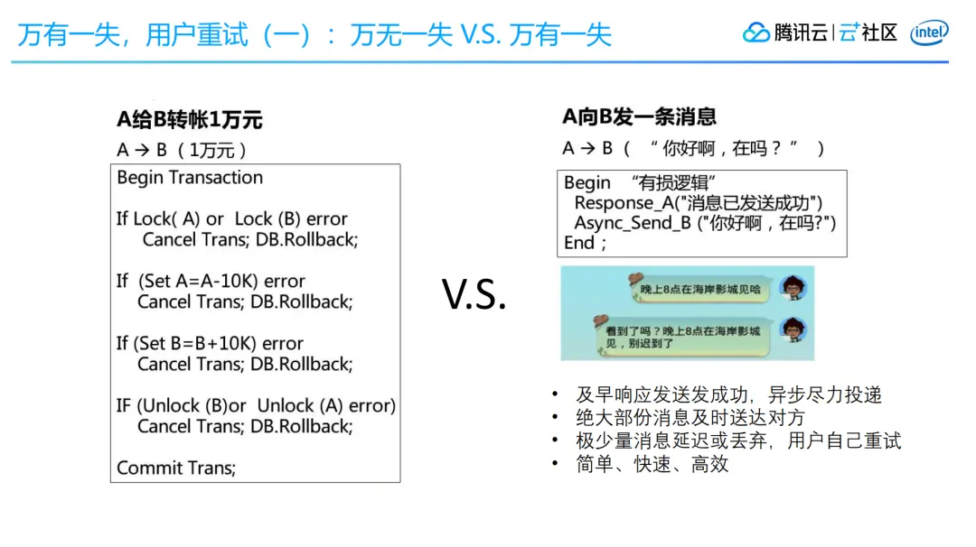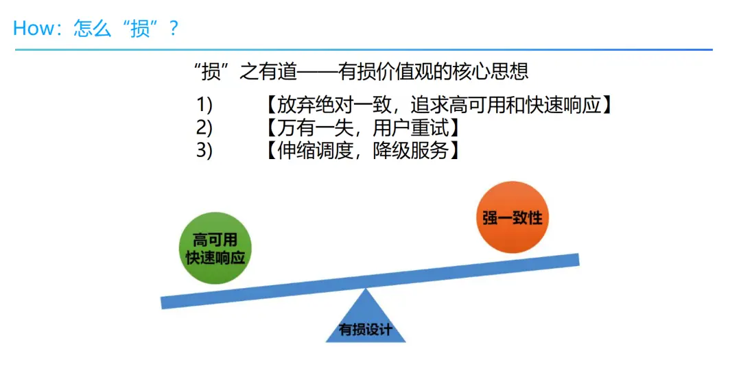 有损服务的核心思想有三个:第一,放弃绝对一致,追求高可用和快速响应。第二,万有一失,用户重试,第三就是伸缩调度,服务降级,并通过几个案例做了进一步展开。