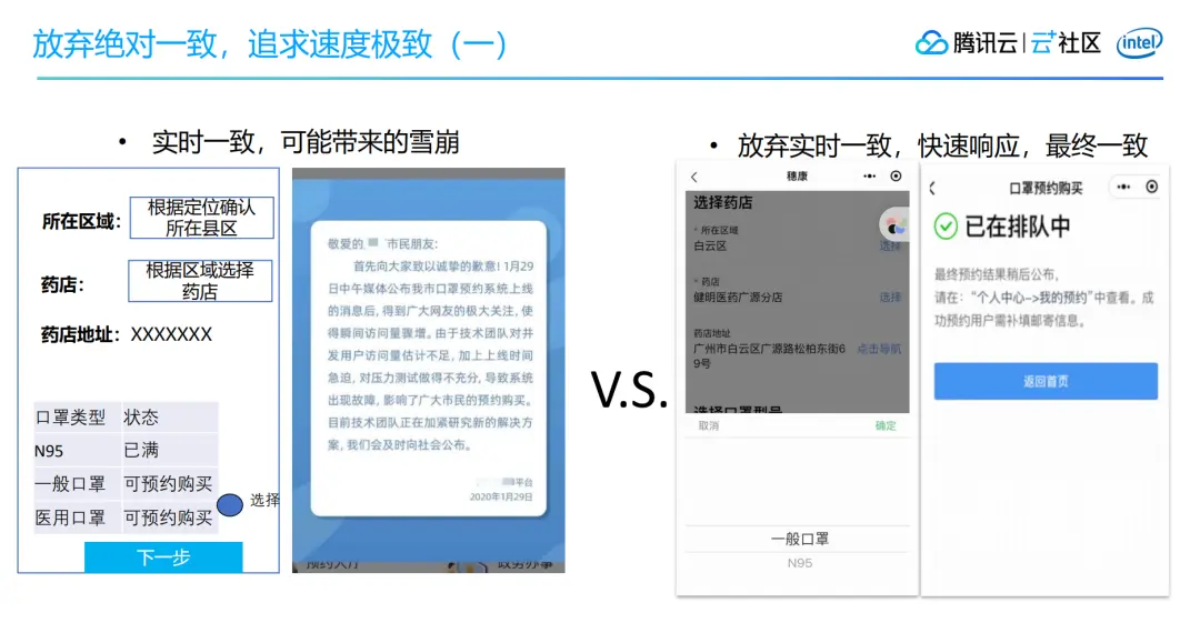 简单来说,我们要在技术、产品上对业务做好这种结构的考虑,细分好业务模块,根据重要性的程度去做划分。回到口罩预约的例子中来,我们其实是放弃了实时一致,做到了快速响应。在他提交以后,告知用户已经在排队,过段时间也能看到结果,最终结果保持一致。如果用户一进来就全部给他们实时的接口,可能一开始就会导致雪崩。