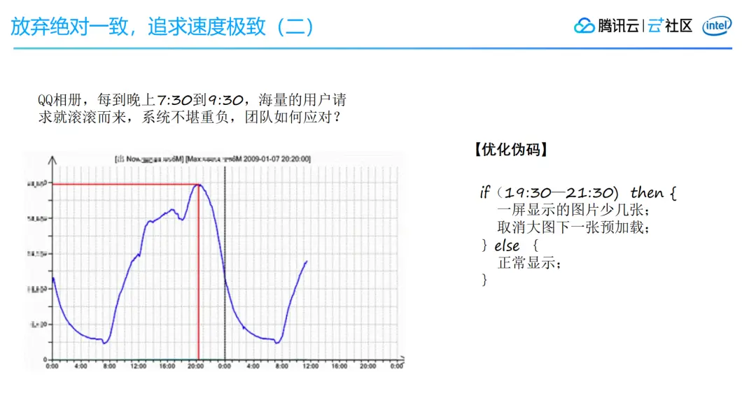 如下图所示:右边伪代码显示的就是这样一个策略,节省了20%的带宽,但用户在高峰期也可以快速得到页面的反馈,付出的代价仅仅是在这两个小时内,用户可能损失了快速查看下一张高品质大图的这样一点点的体验,但是换来的却是在有限的资源情况下,能提供高峰下这种一秒反应的体验。