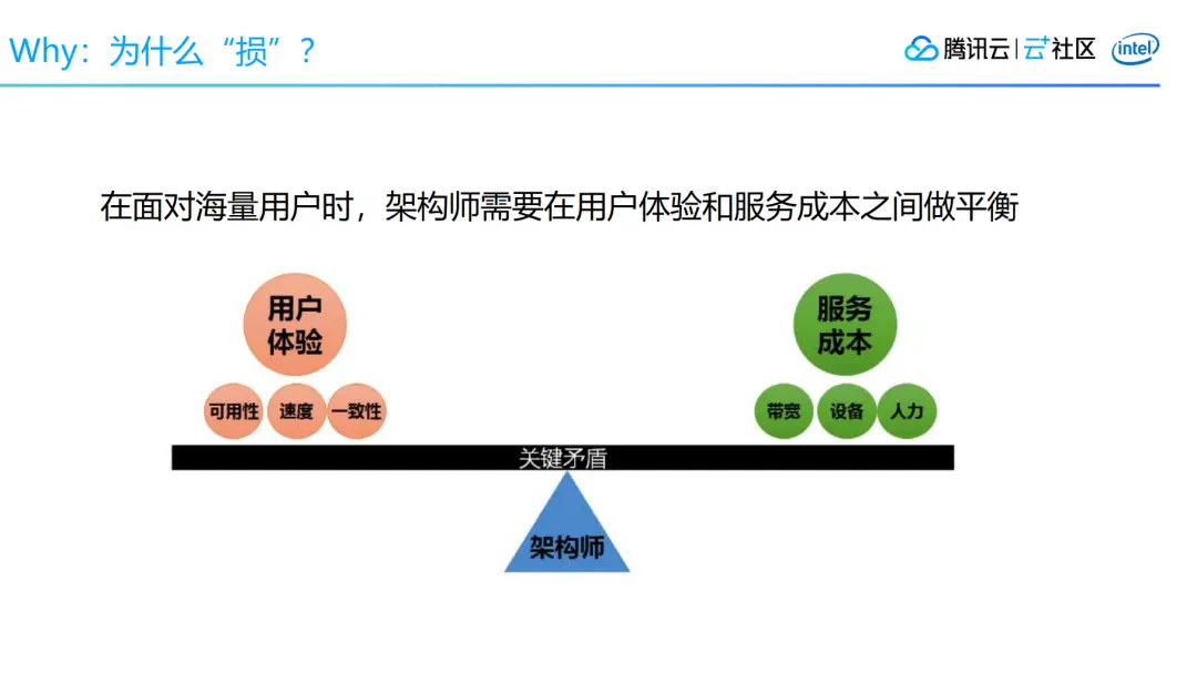为什么要去做有损服务呢?是因为我们现在面对的是海量用户,架构师需要在用户体验和服务成本之间去做平衡。用户体验包括可用性、速度,还有一致性。服务成本,包括投入的带宽、设备,还有人力。