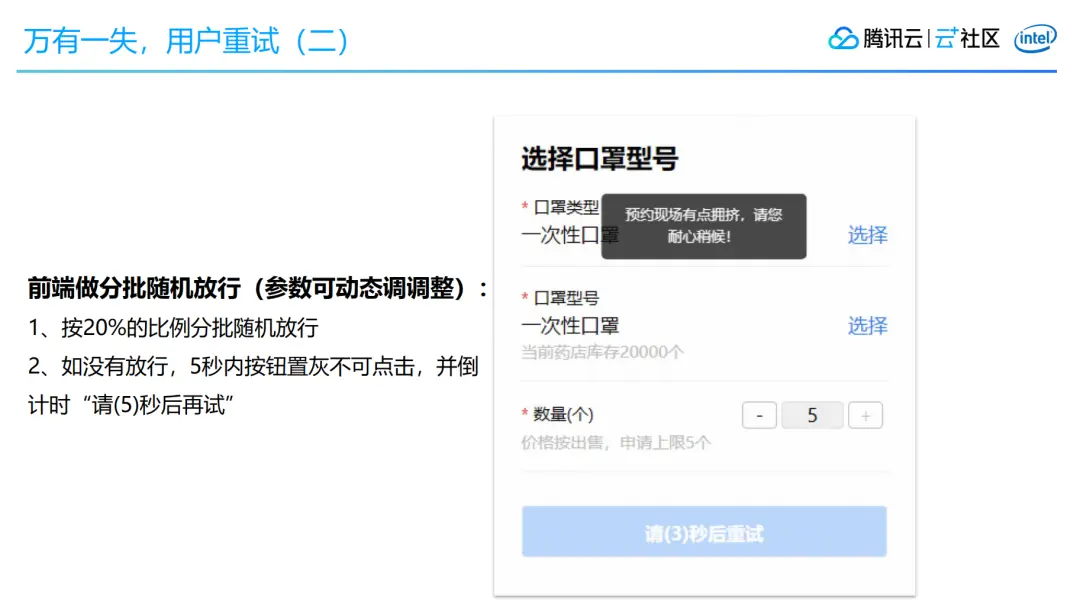 再看看口罩预约,其实我们是分批放行,还有失败重试策略也是参考这个思路。