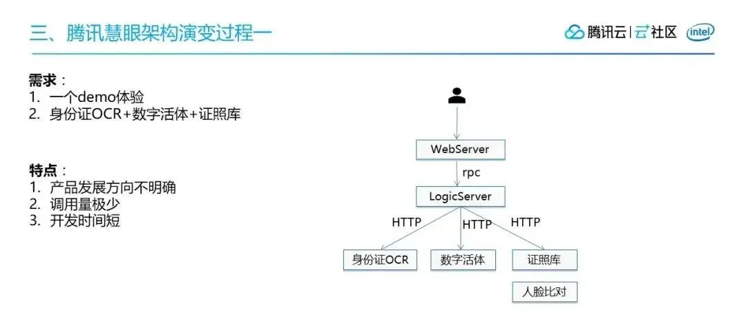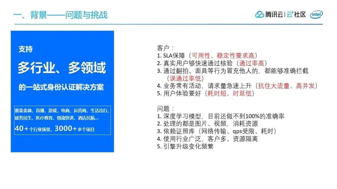 腾讯云慧眼目前支持40+行业,共计3000+项目,客户对系统可用性和稳定性有着高要求,希望真实用户能够快速通过核验,通过率极高。但是如果有些人想通过一些翻拍、面具等方式冒充他人录制一些视频,我们要能准确拦截,要求误通过率极低。业务也经常会有一些线上的活动,会导致请求量急速的上升,所以我们的整个系统架构需要能扛住大流量、高并发。最后就是,要保证用户的体验。
