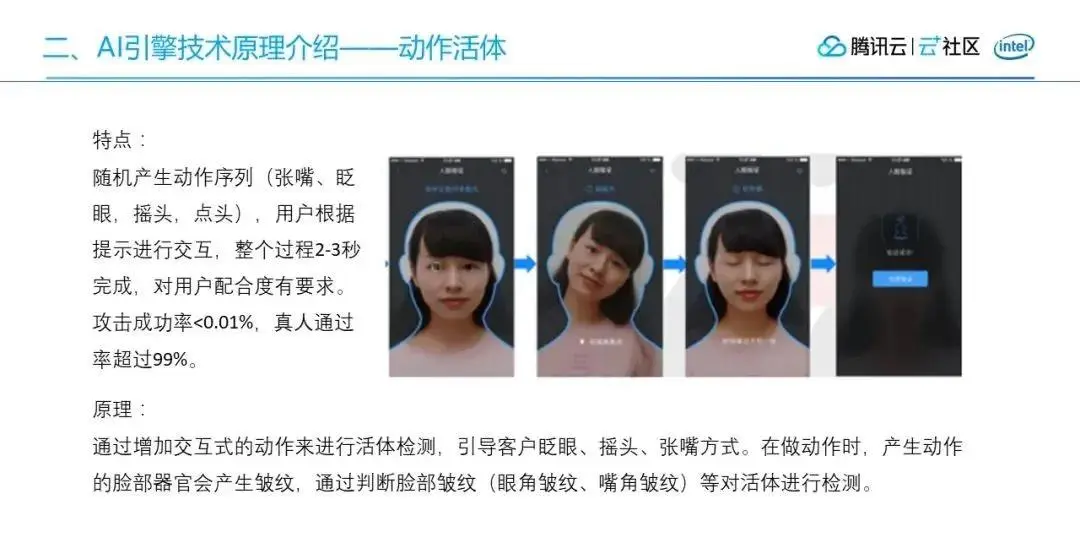 动作活体动物特点是:随机产生动作序列(张嘴、眨眼,摇头,点头),用户根据提示进行交互,整个过程2-3秒完成,对用户配合度有要求。攻击成功率<0.01%,真人通过率超过99%。