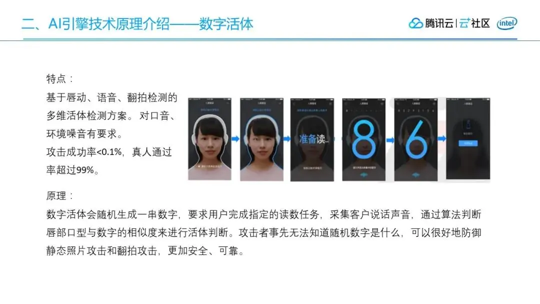 数字活体基于唇动、语音、翻拍检测的多维活体检测方案。对口音、环境噪音有要求。攻击成功率<0.01%,真人通过率超过99%。