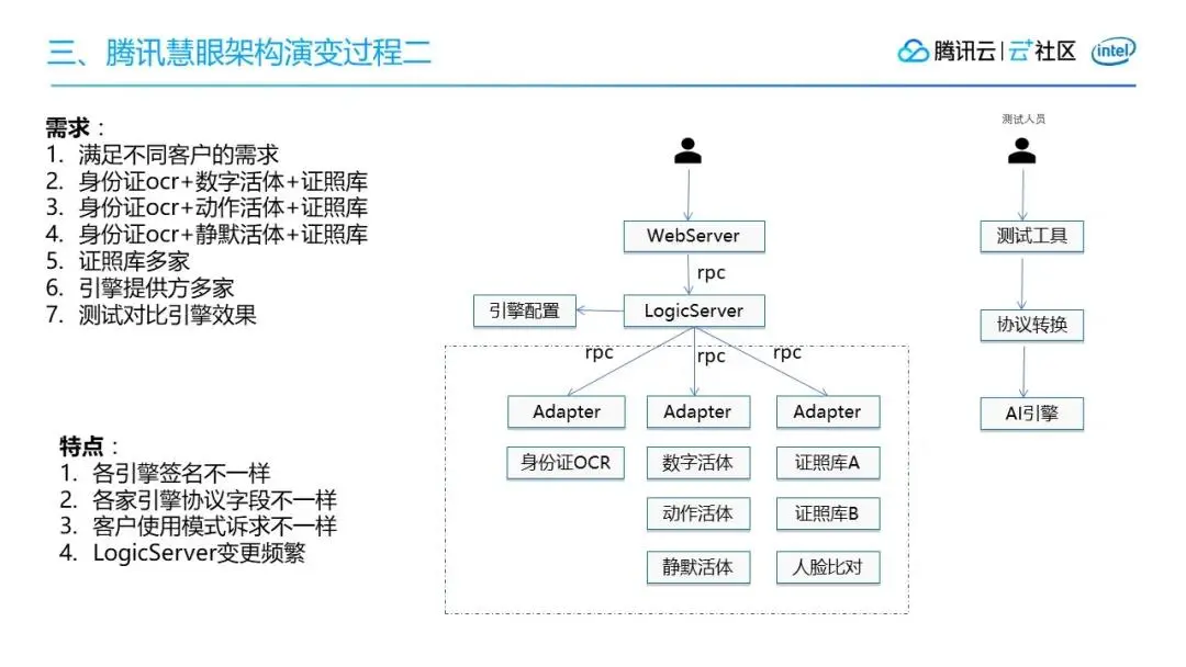 所以我们对逻辑层和引擎层做了一层解耦,加了一个固定的Adapter层,来进行协议转换,再调用AI引擎。随着客户越来越多, 为了满足不同客户的使用场景要求,活体模式也越来越多, 可以支持身份证ocr+数字活体/动作活体/静默活体+证照库等多种认证方式,支持替换多家证照库和引擎提供方。