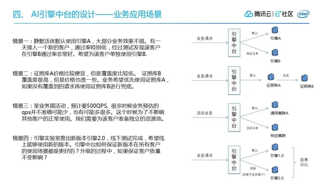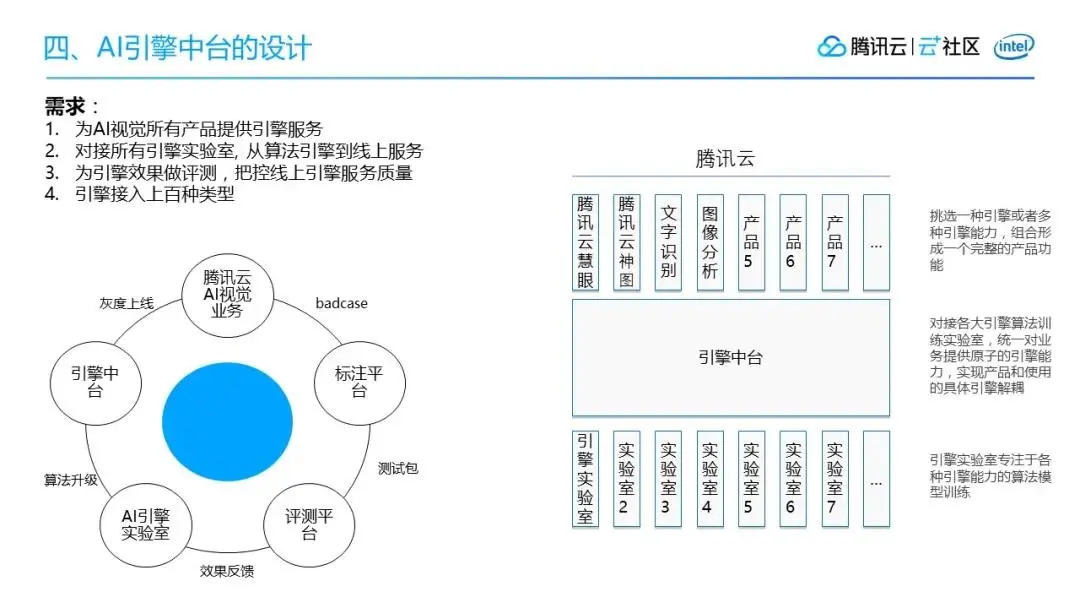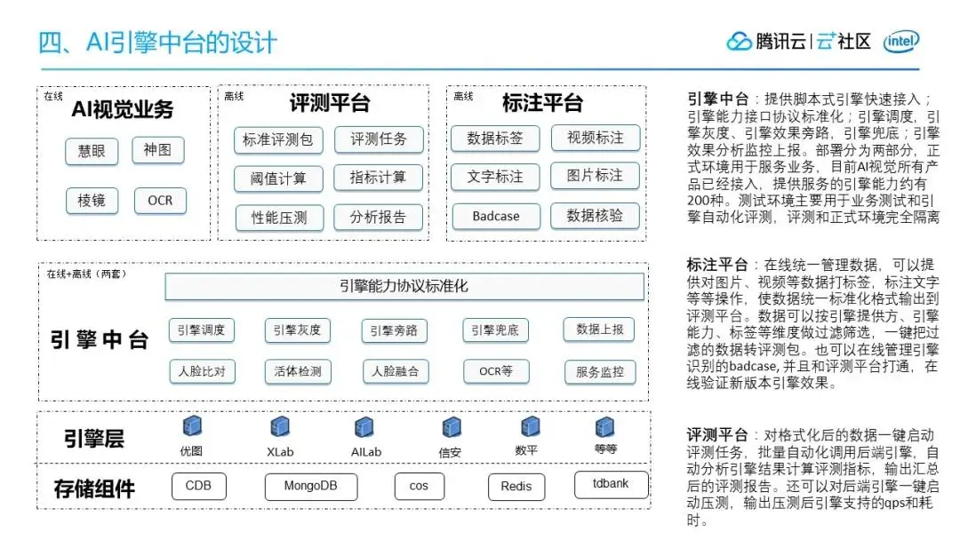 引擎中台对接的是腾讯以及外部的各大实验室,比如腾讯优图实验室、AILab实验室、XLab实验室等等,还有一些安全平台,证照库等。