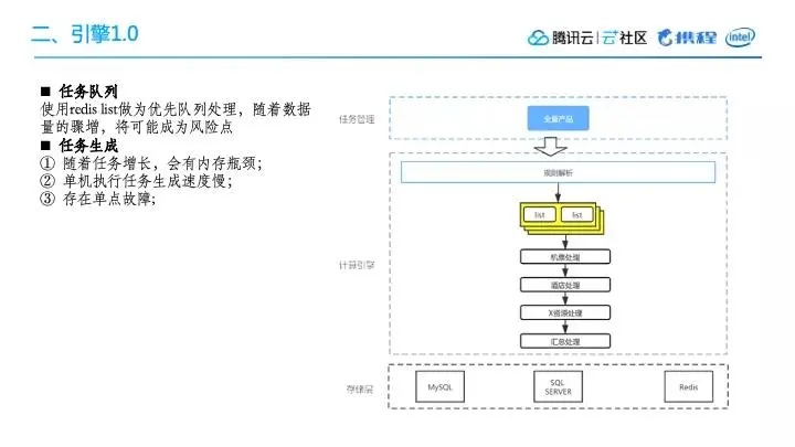 在最早的引擎1.0版本,用MySQL做任务队列,并且针对每个任务队列做了一个同步处理。比如说,在算完机票资源之后,再算酒店,算完酒店后进行单选项资源处理,最终汇总出价格。这里同时还涉及到数据库的同步问题,比如说从MySQL同步到SqlServer。