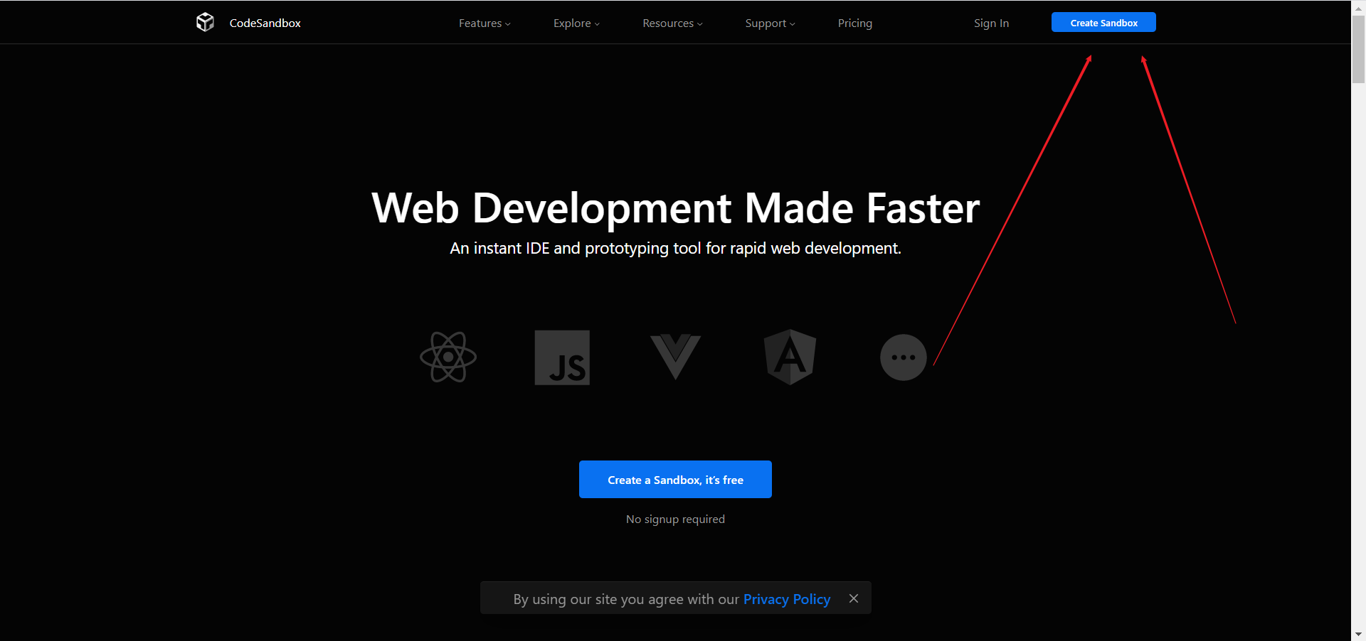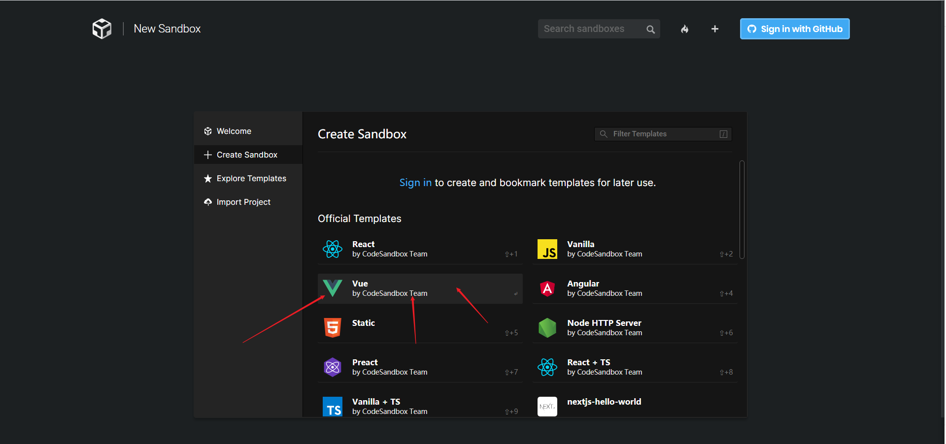 进入codesandbox.io,不要登录(登录后只能创建50个项目,不登录可以创建无限个),进去之后点击Create Sandbox
