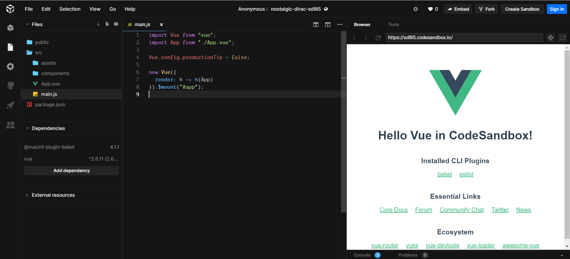 使用Vue需要安装很多个依赖,使用codesandbox.io,就可以直接进行Vue项目的开发