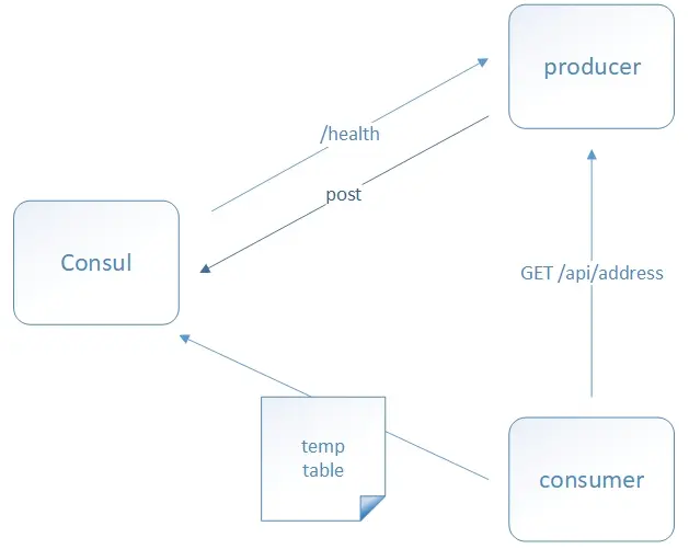 当 Consumer 请求 Product 时,会先从 Consul 中拿到存储 Product 服务的 IP 和 Port 的临时表(temp table),从temp table 表中任选一个· Producer 的 IP 和 Port, 然后根据这个 IP 和 Port,发送访问请求;temp table 表只包含通过了健康检查的 Producer 信息,并且每隔 10s(默认)更新。