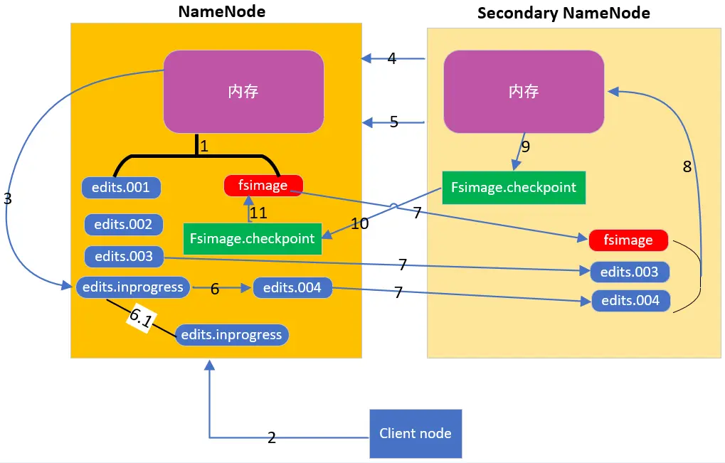 8-9、Secondary NameNode加载编辑日志和镜像文件到内存去做合并,生成新的镜像文件fsimage.chkpoint。