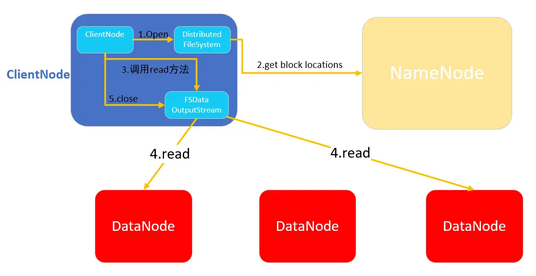 3、客户端通过namenode返回的信息调用FSDataOututStream方法读取最适合的副本节点(本地→同机架→数据中心)。