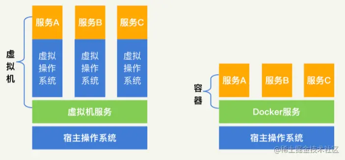 我们重点解释一下“轻量化”和“隔离”这两个词。首先是轻量化。我们可以对比虚拟机来进行理解。虚拟机是自己创造了一个虚拟内核,让这个虚拟内核去和虚拟机的进程进行沟通,然后虚拟内核再和真实的 Linux 内核进行沟通。而 Docker提供的容器,简化了这个沟通过程,让 Docker 中的进程直接和 Linux 内核进行沟通。