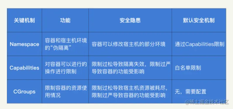 所以,当一个宿主机中运行了多个 Docker 容器的时候,我们可以通过 CGroups,给每一个容器弹性地分配 CPU 资源。同样地,这个限制既不能过松,过松会导致某一个 Docker容器耗尽宿主机资源,也不能过严,过严会使得容器内的服务得不到足够的资源支持。这都需要我们自己经过慎重考量来进行配置,没有默认的安全机制可以辅助我们。现在,你应该已经了解 Docker 服务中的 3 个主要机制了。这里,我把这 3 个主要机制的特点总结成了一张表格,帮助你加深理解。