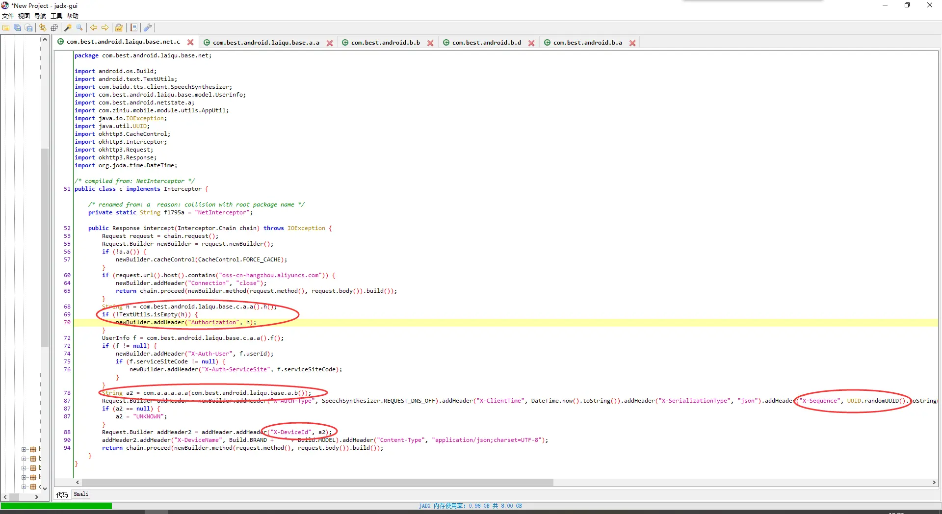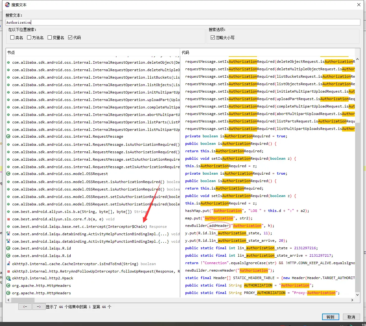 Jadx反编译后搜索Authorization、X-Sequence、X-DeviceId、netmonitor_linkid这些关键字,得下图