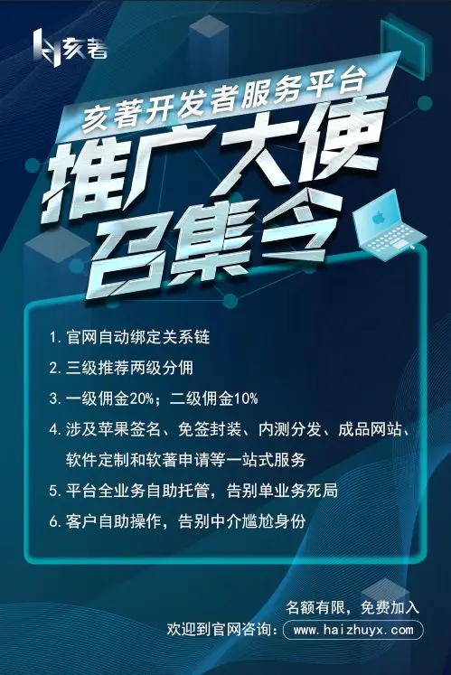 亥著是为开发者及APP运营人员提供从应用内测到应用上架的服务平台,通过在线封装、分发、苹果签名、真人测试和应用上架,使APP从内测到上架变得简单高效。客户不仅可以在亥著进行内测,还可以加入亥著,成为推广大使,获取佣金。
