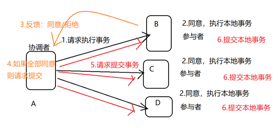 总体思路: 将一个任务(多个步骤) 进行2步操作: 1.请求各个节点执行 ; 2.如果大家都同意,请求一起提交