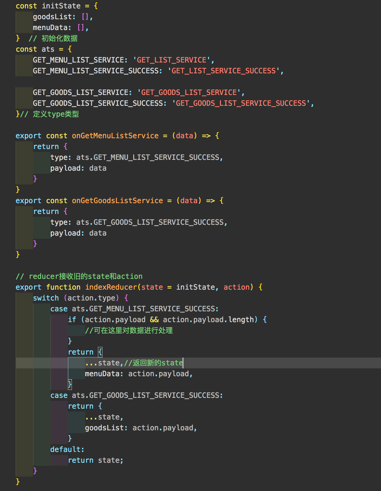 4、先写redux的initState、type、action、reducer。
