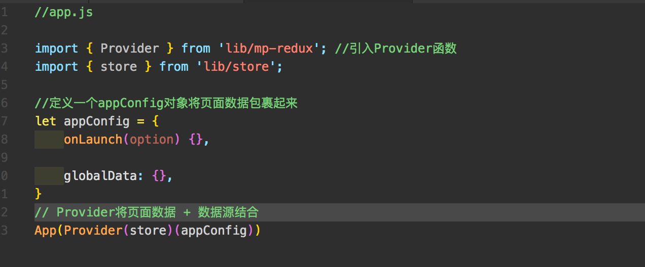 6、小程序的入口文件是app.js,所以在app文件中将页面(view),store,state三者结合起来。
