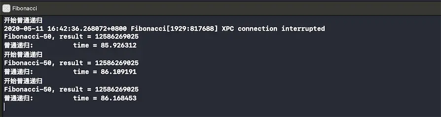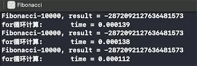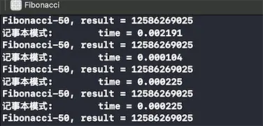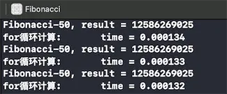 对于暴力求解的优化一般是缓存已经求得的结果, 如 [f(3): 2, f(4): 3, f(5): 5, f(6): 8, ...], 下次求解时直接从缓存中查找并返回,本文不作过多讨论,具体可见demo中的 fibonacciUseMemory 等, 其 count = 50 的执行结果如下: