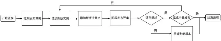 要了解一个灰度发布系统的功能,个人觉得有必要先了解灰度发布的概念定义和灰度发布流程,从概念和流程中明确灰度的目的并梳理出流程中系统工具可以支撑的地方,那么实现一套发布系统需要考虑的地方也就清楚了。灰度发布的目的首先是为了应用从老版本升级到新版本的时候能做到平滑升级,升级过程中通常会先按照一定发布策略选取部分用户流量,先行请求新版本的应用,通过收集这部分用户对新版本应用的反馈,以及新版本应用实例本身的日志、性能、稳定性等指标来评审新版应用。根据评审情况,决定是否继续增加新版本的应用实例和流量占比,直至全量升级,或者发现问题回滚至老版本。对应的灰度发布流程图如下: