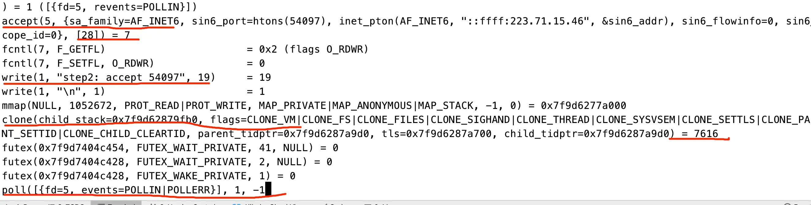 先调用了accept函数建立一个新的socket fd=7,然后调用clone函数,创建一个新的线程,这个线程的pid=7616。
