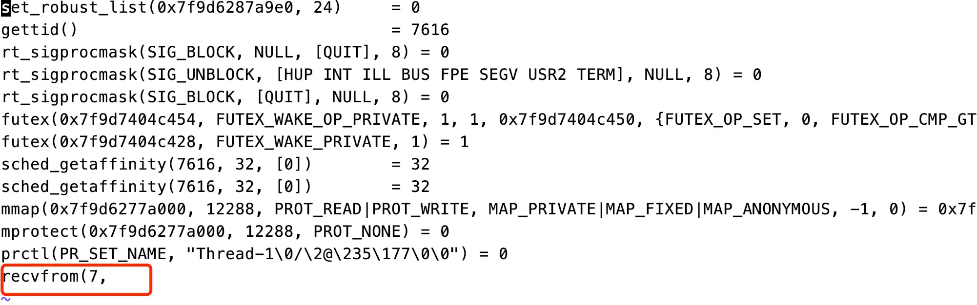 线程7616阻塞在recvfrom(fd=7)函数上。