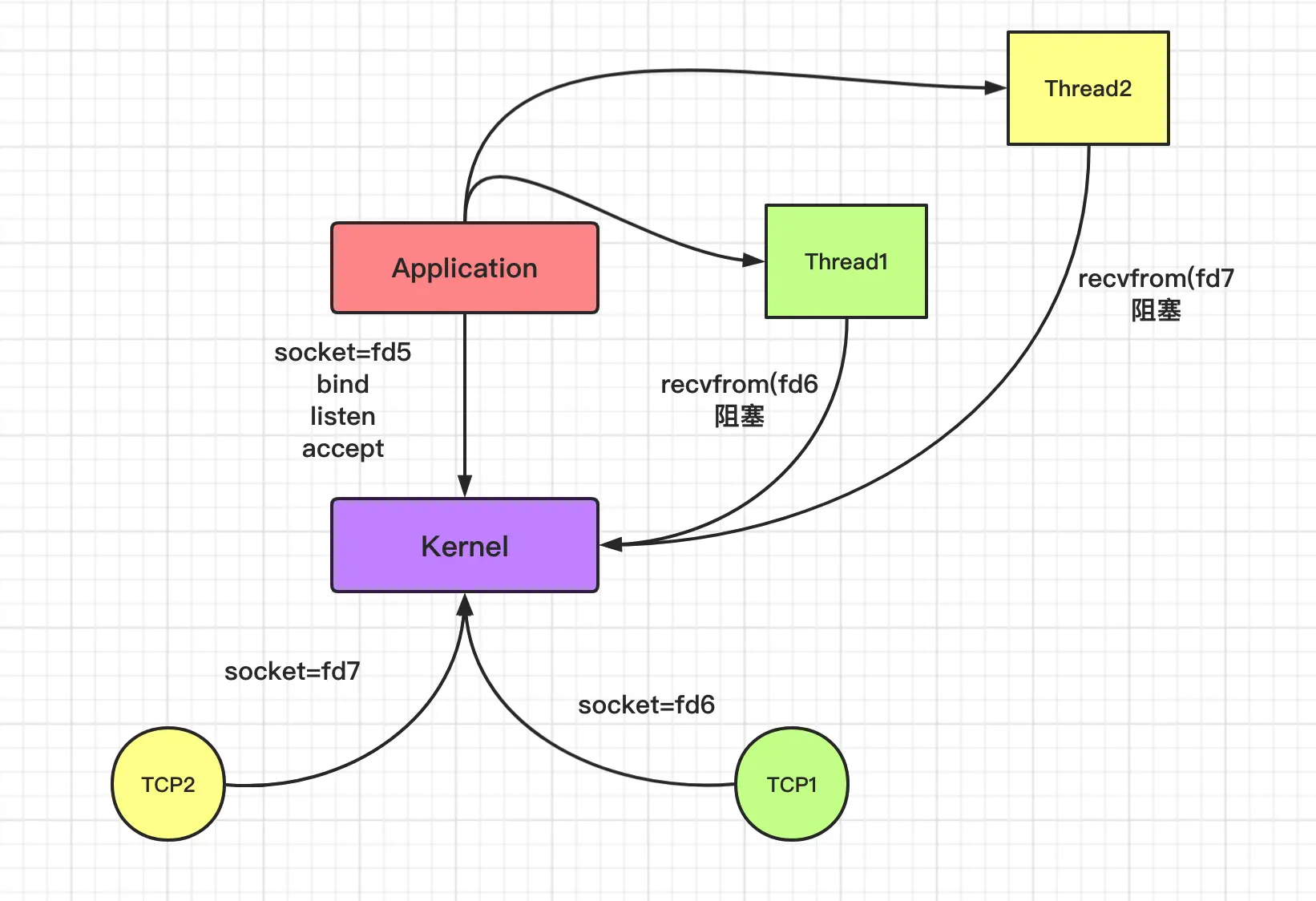 所以BIO的本质是因为系统调用的recvfrom(fd)函数是阻塞的,所以必须使用多线程才能进行socket的连接和读取。