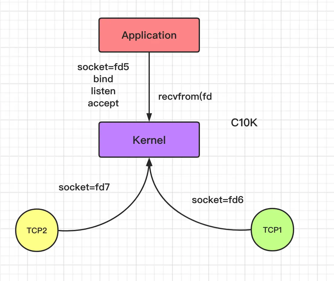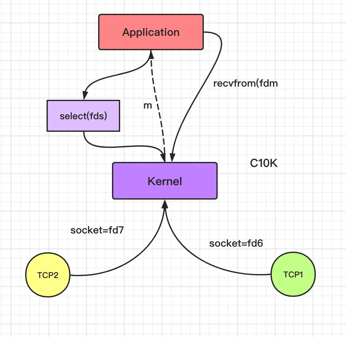于是内核提供了一个select的系统调用(多路复用),它可以把发生了可读的socket的文件描述符返回,然后程序再调用recvfrom函数,这样就大大减少了系统调用的次数。