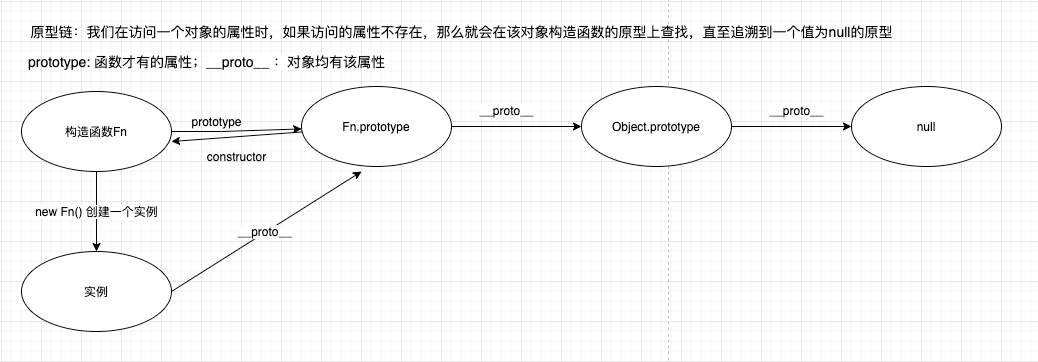原型链:我们在访问一个对象的属性时,如果访问的属性不存在,那么就会在该对象构造函数的原型上查找,直至追溯到一个值为null的原型。