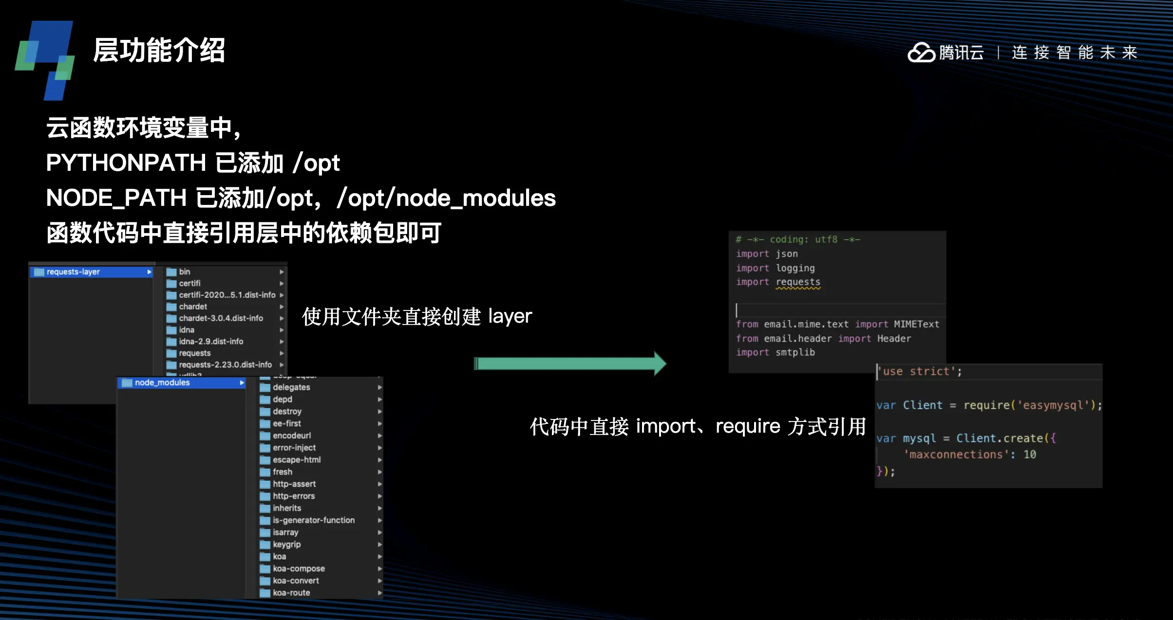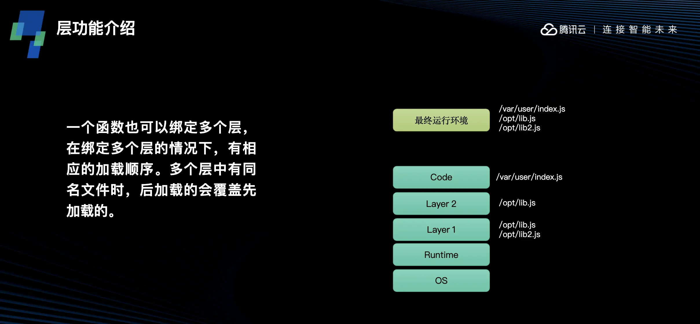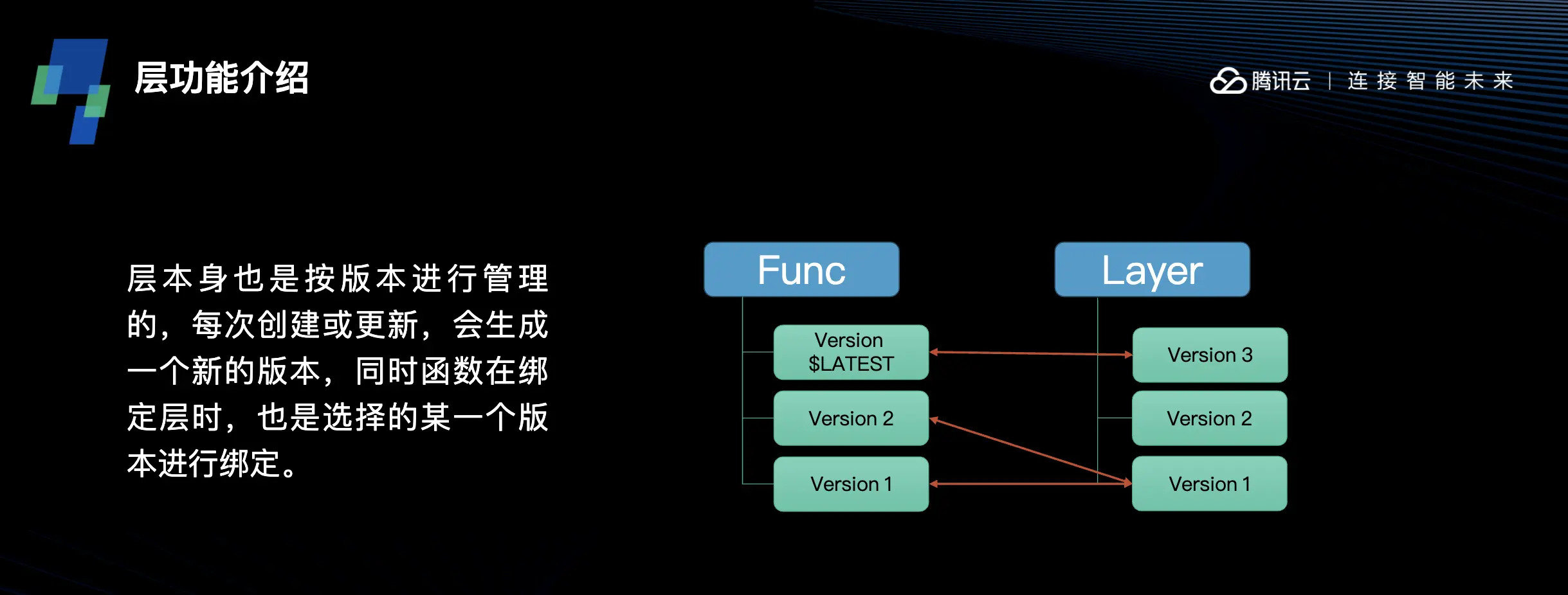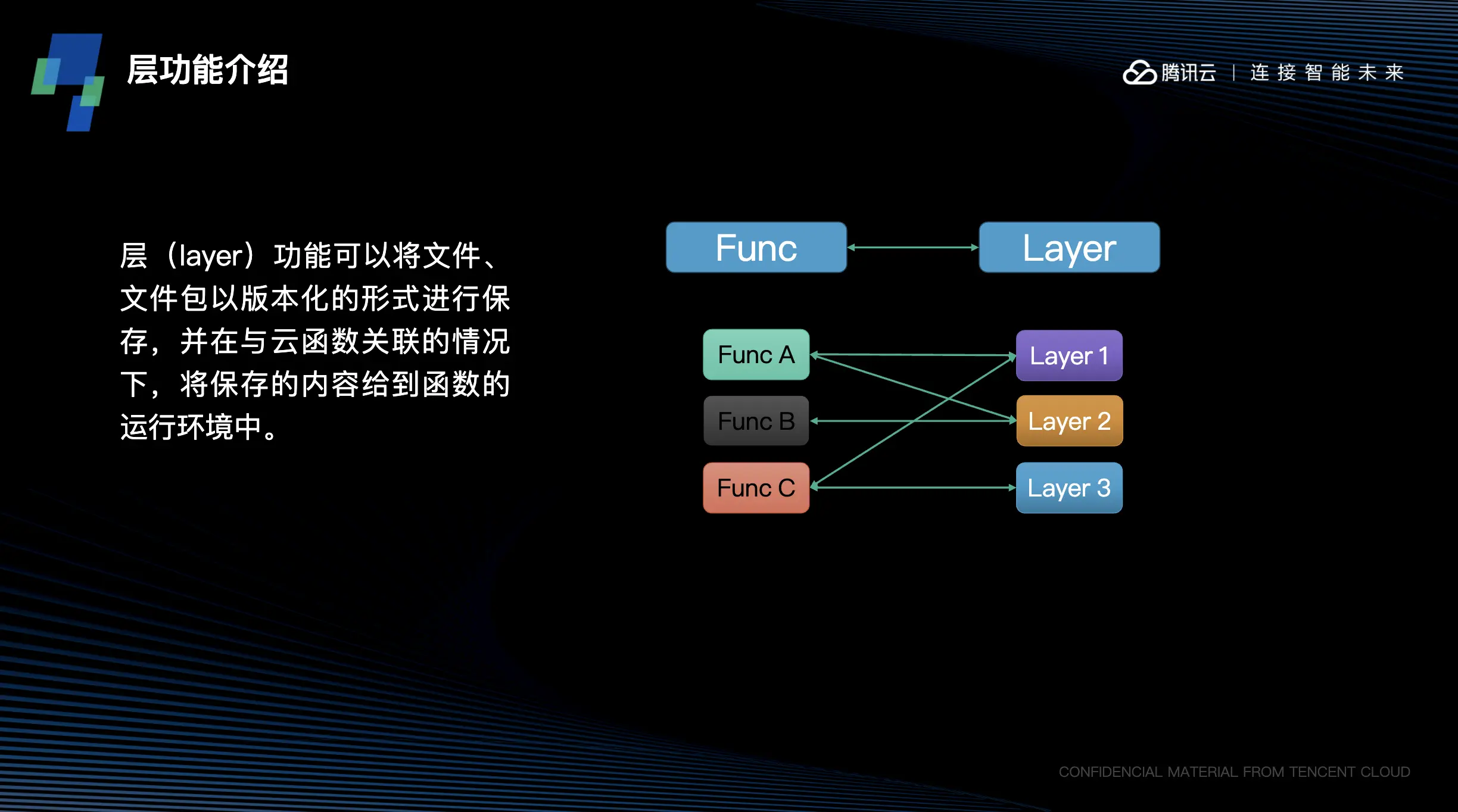 腾讯云的 SCF 云函数近期推出的层功能,就是为了这类不经常变动的依赖库或静态文件而准备的产品功能。通过使用层功能来存储及管理依赖库,并在使用时按需与函数进行绑定,就可以实现依赖库的多函数共享,仅需上传一份,就可以在多个要使用到的函数中绑定并引用;通过与云函数绑定的使用方式,也就意味着不需要在云函数的业务代码中再附上相应的依赖库了,可以将业务代码和依赖库分开进行管理和部署,降低云函数每次上传时需要提交的包大小,加快上传更新的速度。