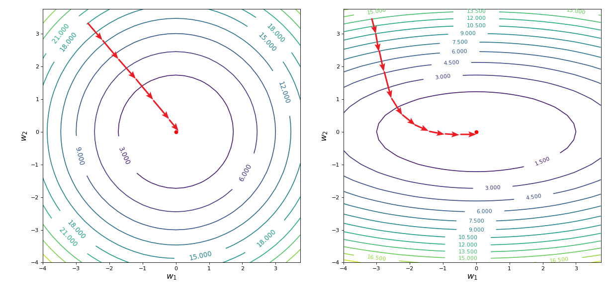 由于梯度的方向始终与等高线保持垂直, 所以理想情况下不管随机初始点选在何处,我们都希望梯度下降算法沿着如下图左边所示的方向达到最低点,而非右边的情形: