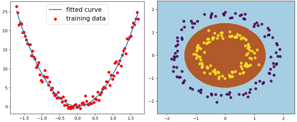 所谓的特征映射就是将原来的特征属性通过各种方式,将其映射到高维空间的过程。当原有的特征被映射到高维空间后,就可能存在一个线性的超平面能够对数据进行很好的拟合。因此,对于上图中的两种情形我们都可以通过前面介绍的方法将其映射为多项式特征,如:将映射为