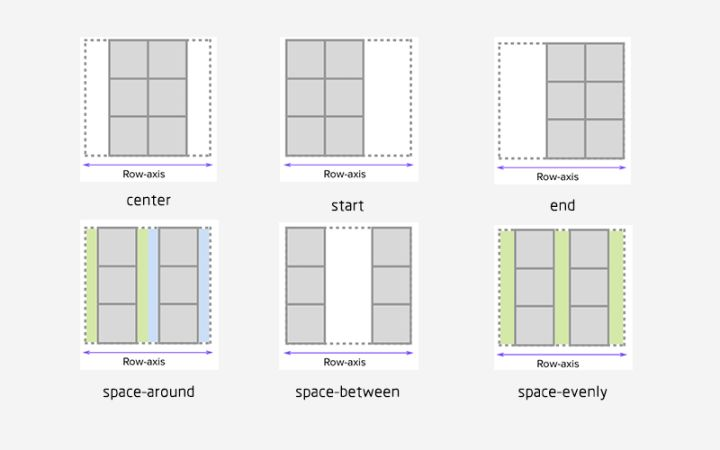 注:网上找了一张图片能更好的解释 justify-content 属性值的表现,如图: