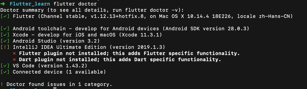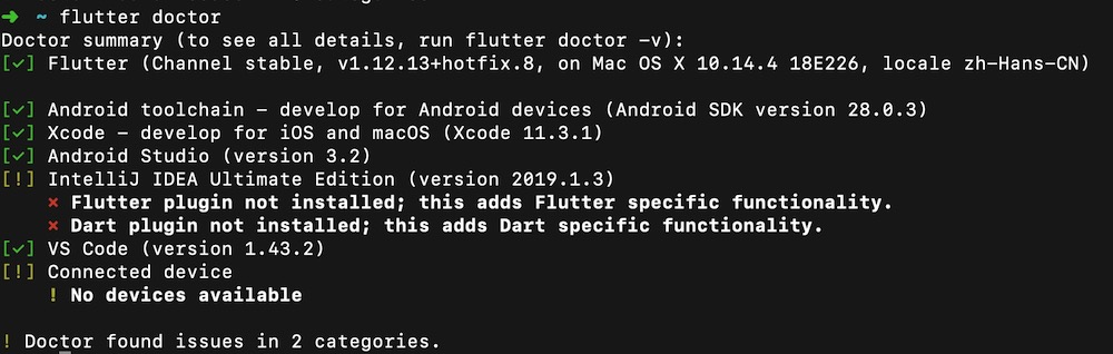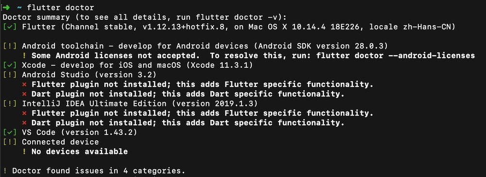 每个人的环境不太一样,因此 flutter doctor 检测出来的问题也会有差异。因为我电脑之前使用过 Xcode、 Android Studio、VSCode,所以报的问题相对较少,IntelliJ IDEA 倒是用的不多。
