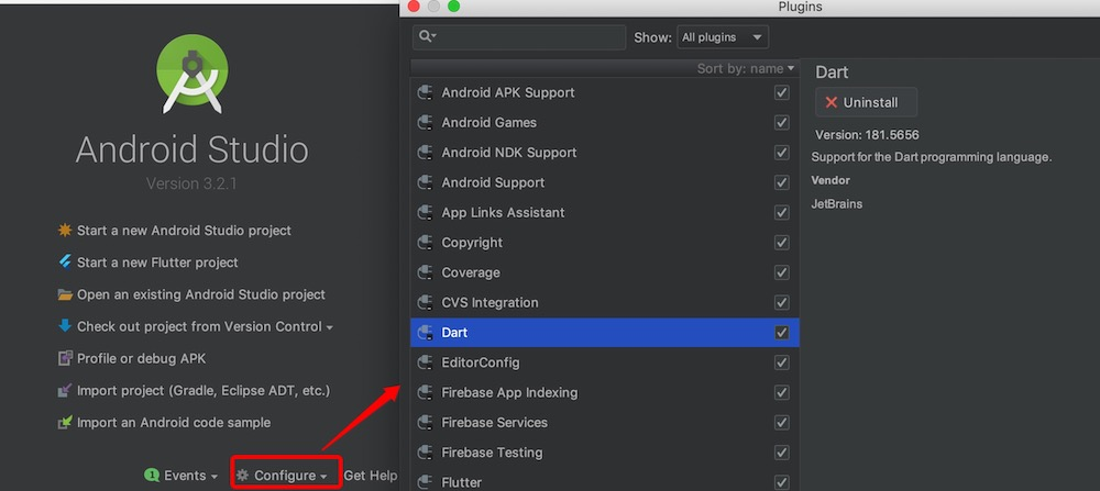 这个意思也很清楚,打开 AS,在 configure 里安装 Flutter 以及 Dart 插件: