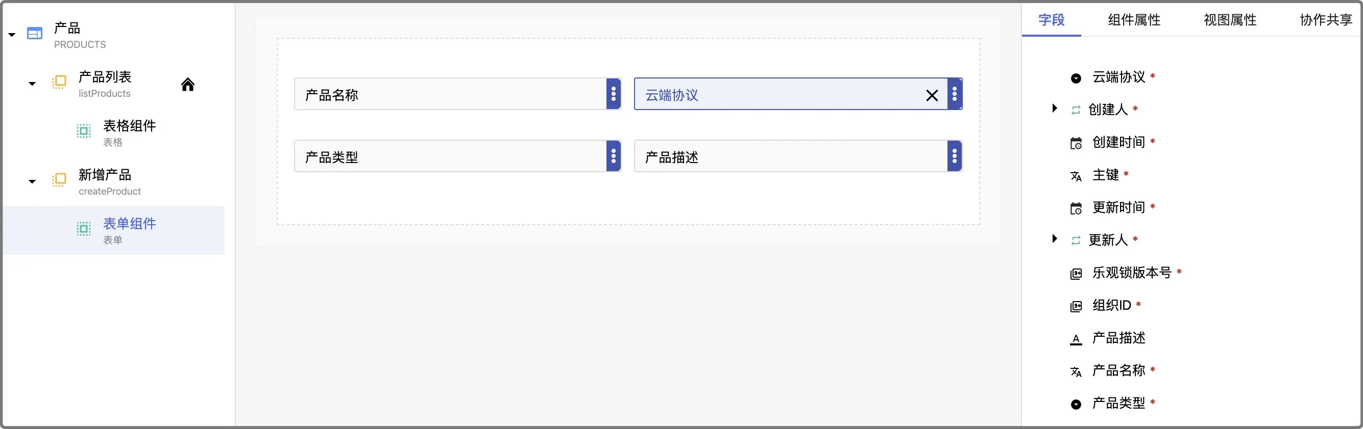 3. 左边页面结构视图中展开产品节点,选择下面的产品列表->表格组件节点,从右侧字段下拖动字段到中间配置区域: