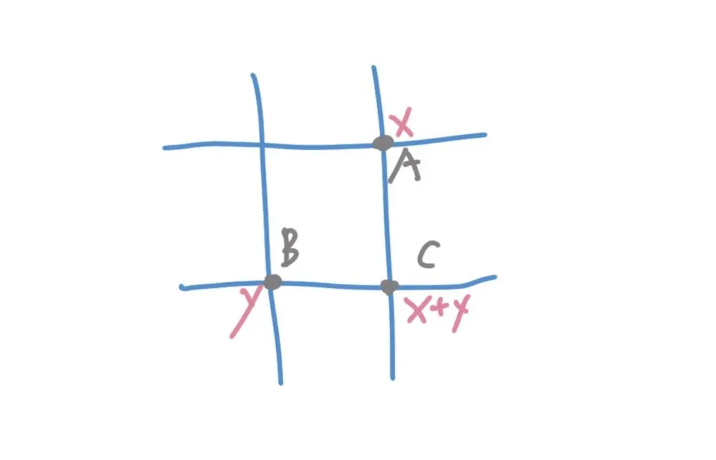 这个结论我们很多人都知道,因为C点只有两个来源,一个是A点一个是B点。它既可以从A点来,也可以从B点来,所以应该是一个加和的关系。