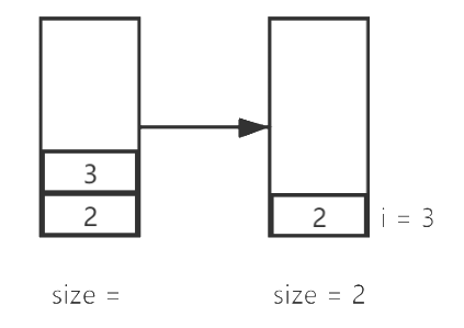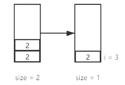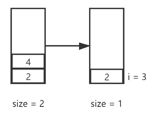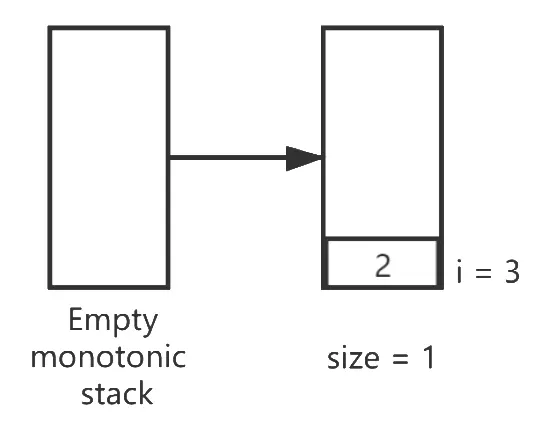好了注意到了上面的一个小trick,我们继续。下一步需要入栈的元素是1,1小于栈顶的2,所以2需要先出栈: