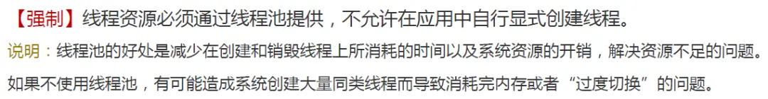 既然使用多线程,那就必须要使用线程池,至于理由,说再多都不如借鉴一下权威阿里《Java开发手册》里一段关于线程使用的强制规定。
