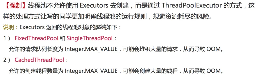 还有线程池的创建不要使用Executors,至于原因嘛,还是引用阿里权威手册《Java开发手册》中的描述。