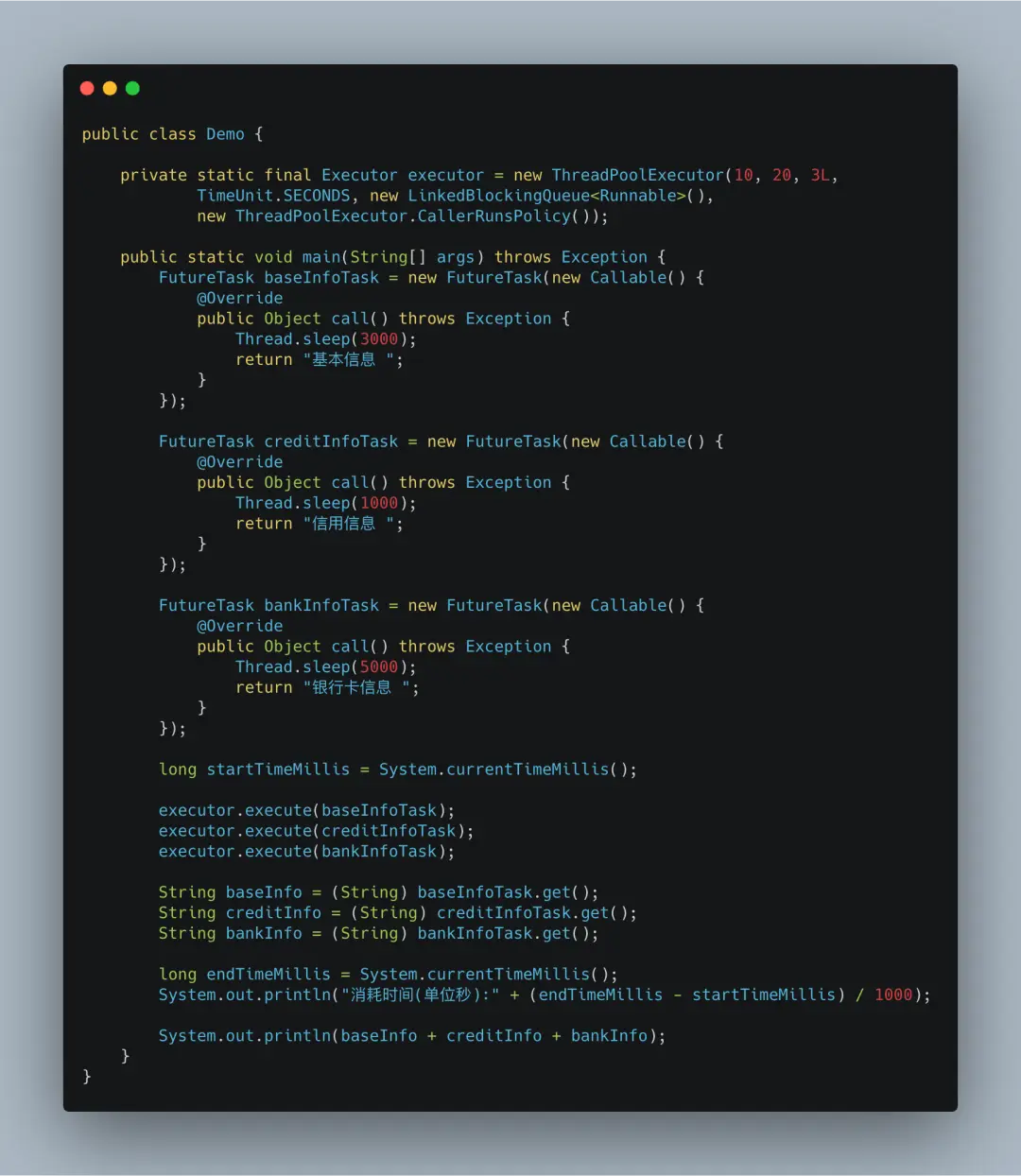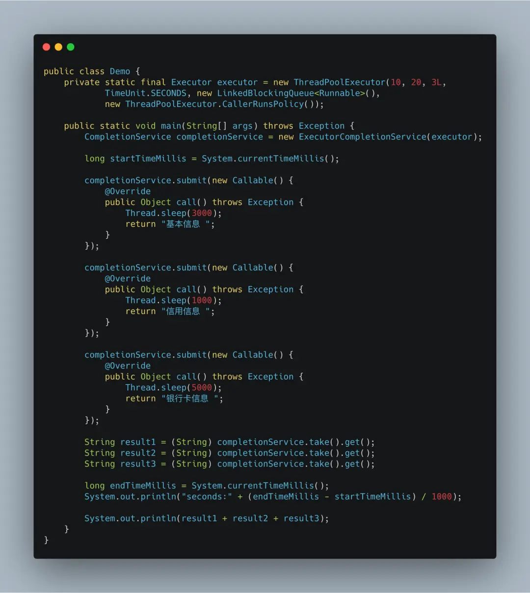 上面的代码,你会发现还有继续优化的点,FutureTask#get方法是阻塞的,也就是说如果对应的任务还没有执行完成,调用get方法会被阻塞在那里,直到线程执行完成。再设想一下,如果baseInfoTask.get()执行后还有其它数据转换的行为,那么它后面的creditInfoTask.get()和bankInfoTask.get()就会延后执行,所以最好的办法是随机,谁先执行完成就先获取谁的结果并执行其它任务,使用java.util.concurrent.ExecutorCompletionService继续优化,撸代码。