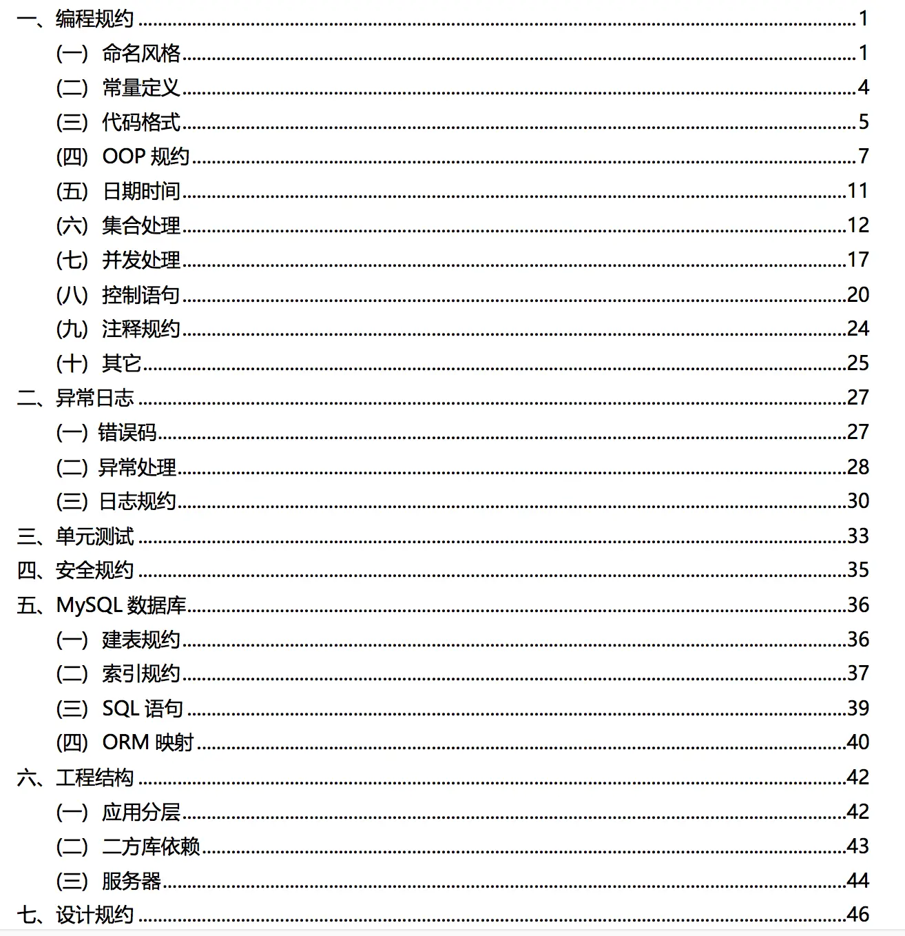 这个手册是阿里巴巴多年开发经验的结晶,除了上面说到的命名、注释等提升代码可读性、易读性的规约,还包括了正确的建表、良好的工程结构、良好的异常处理、安全控制,还有一些平时常用 JDK 功能的防坑指南。