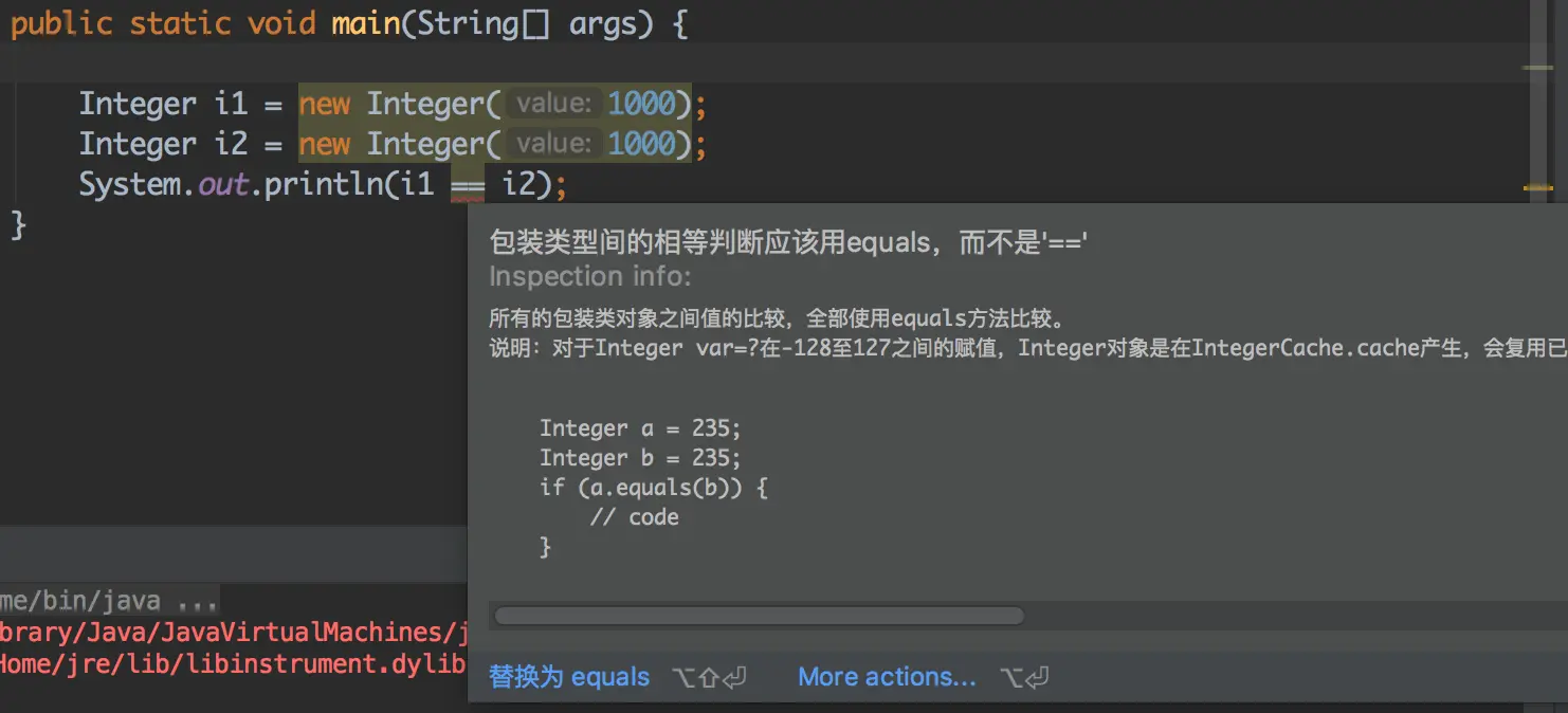 开启之后,当我们在代码里写了违反规约的代码时,就会给出提示,比如我在代码里用 ==比较两个 Integer,就会在 ==下面出现警告提示,并且告诉你正确的姿势是什么。