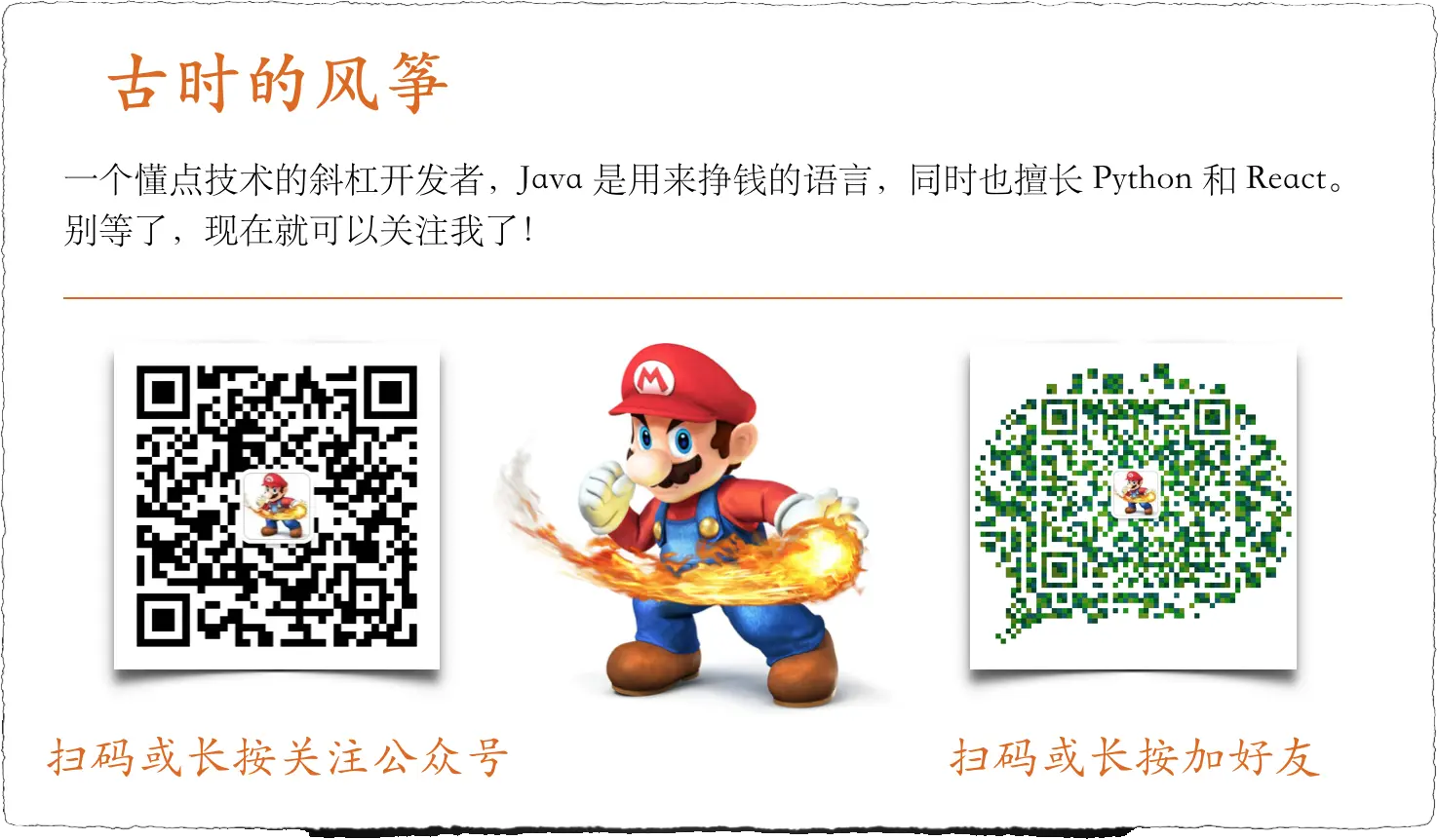 我是风筝,公众号「古时的风筝」,一个在程序圈混迹多年,主业 Java,另外 Python、React 也玩儿的很 6 的斜杠开发者。可以在公众号中加我好友,进群里小伙伴交流学习,好多大厂的同学也在群内呦。