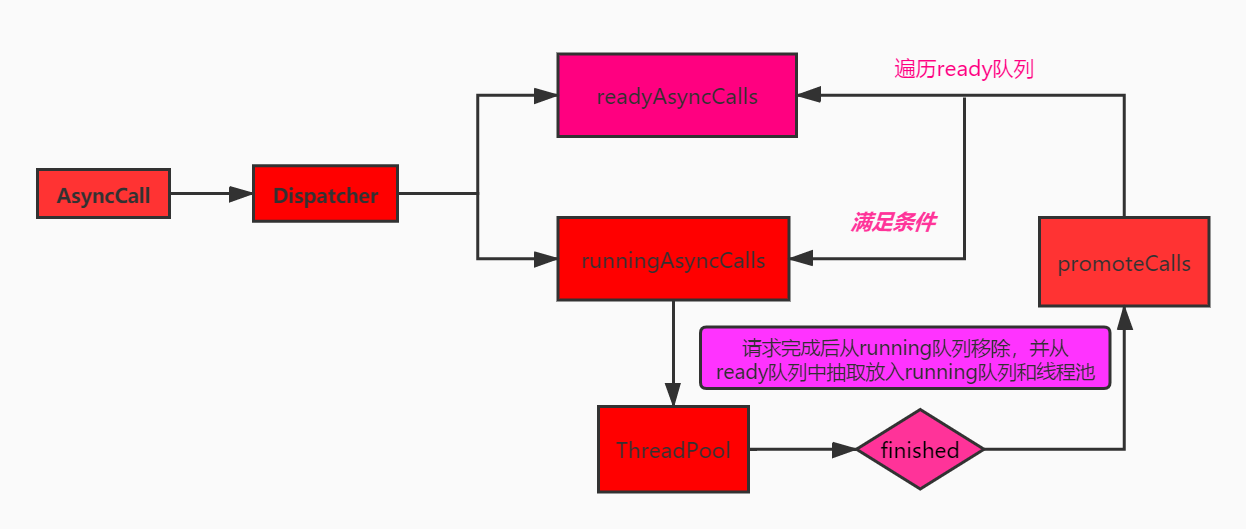 }异步请求的执行:通过上面的分析可以知道,异步请求最终会通过分发器加入线程池