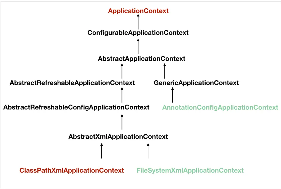 我们可以看到,ClassPathXmlApplicationContext 兜兜转转了好久才到 ApplicationContext 接口,同样的,我们也可以使用绿颜色的 FileSystemXmlApplicationContext 和 AnnotationConfigApplicationContext 这两个类。