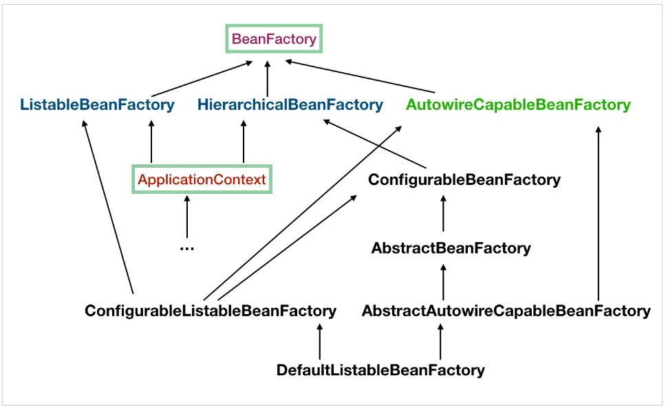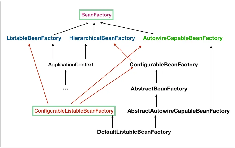 - ConfigurableListableBeanFactory 也是一个特殊的接口,看图,特殊之处在于它继承了第二层所有的三个接口,而 ApplicationContext 没有。这点之后会用到。